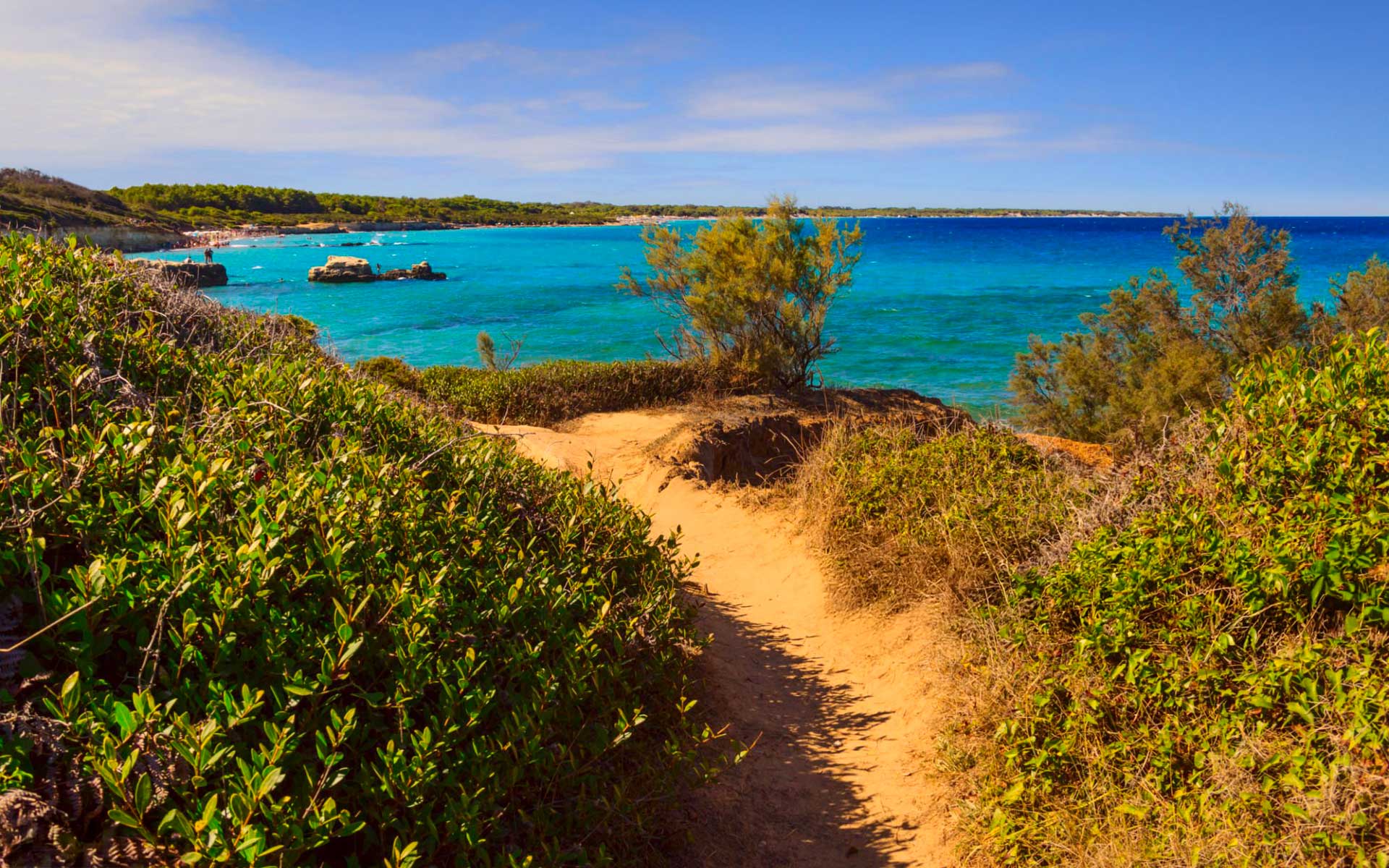 Le spiagge di Alimini sono tra le più amate del Salento per la loro varietà e il contesto naturale che le circonda. Qui la costa si apre in lunghi tratti sabbiosi, intervallati da pinete e dune, con un mare limpido che invita a lunghe nuotate e momenti di puro relax.